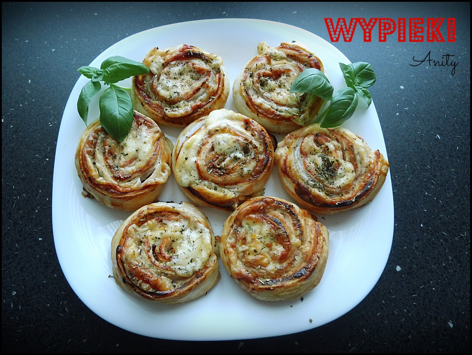 Zawijamy, kroimy w plastry,smarujemy jajkiem. Wierzch przyprawiamy. Wykładamy na blachę wyłożoną papierem do pieczenia. Pieczemy ok. 10 minut w temp. 200 stp. C